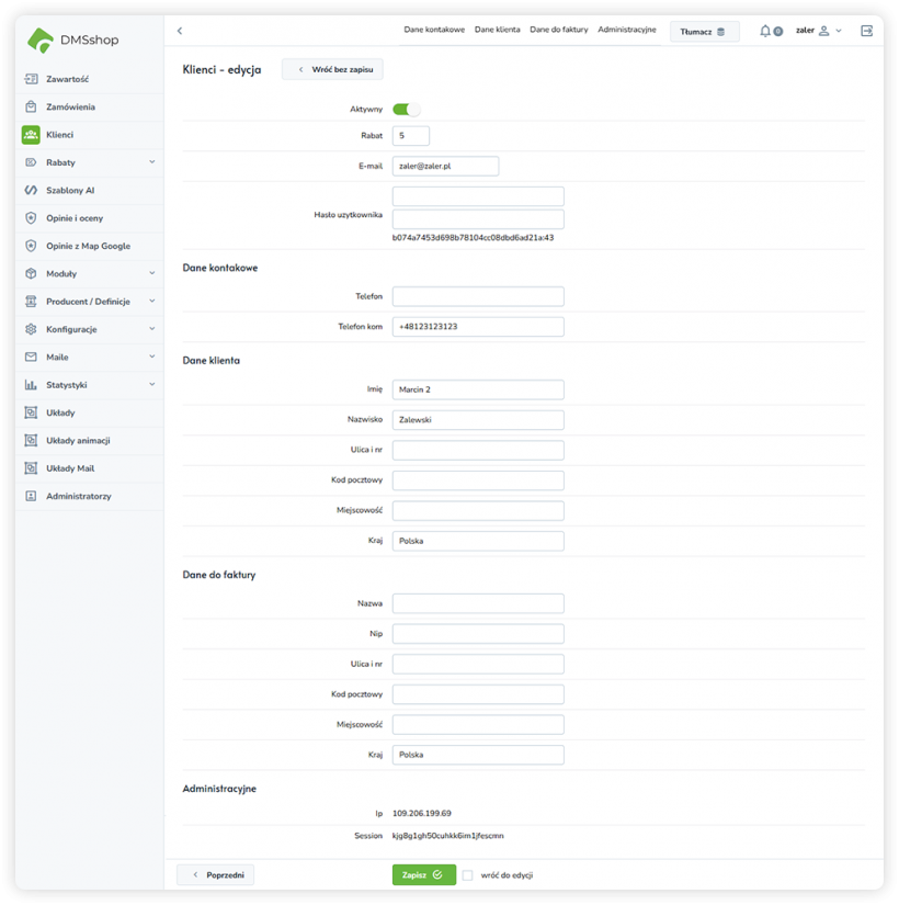 W systemie DMSshop widok edycji klienta umożliwia zarządzanie danymi konta klienta, jego informacjami kontaktowymi, danymi adresowymi oraz danymi do faktury. Widok ten pozwala również na kontrolę statusu konta oraz dostęp do podstawowych informacji administracyjnych.