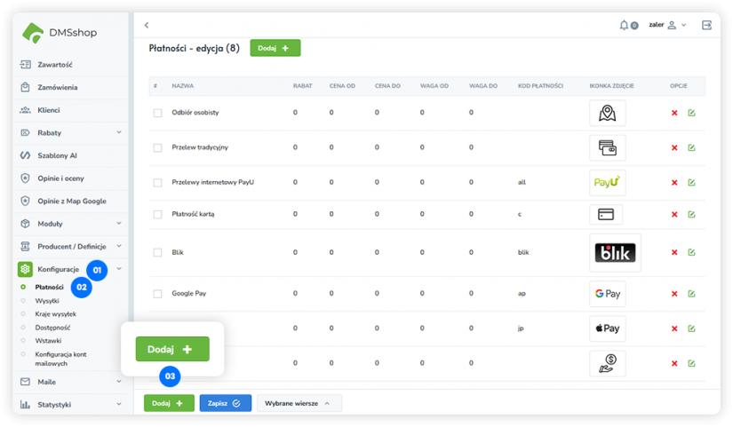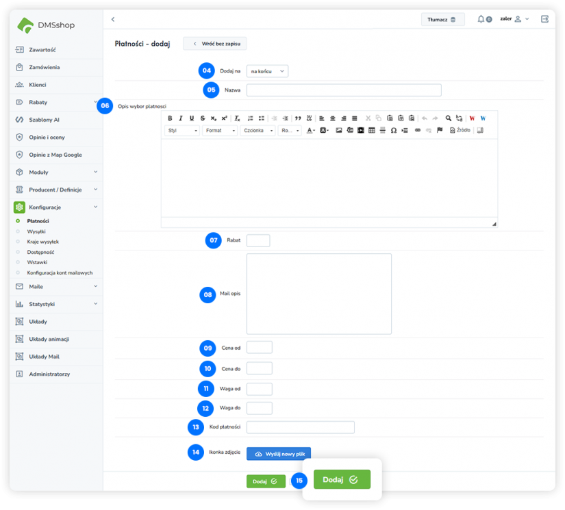 15 Dodaj – Zapisuje metodę płatności i udostępnia ją klientom w sklepie zgodnie z ustawionymi warunkami.