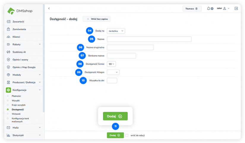 Po zalogowaniu do panelu DMSshop należy wykonać następujące kroki:
