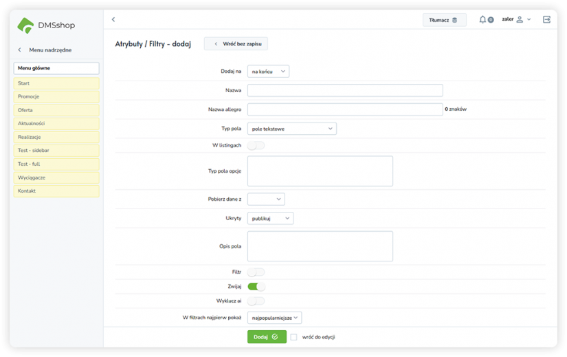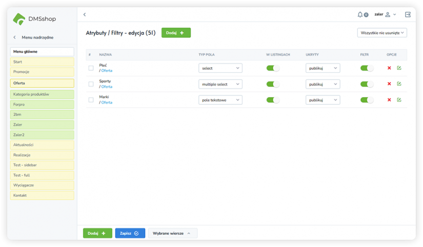 W systemie DMSshop moduł Atrybuty / Filtry umożliwia zarządzanie specyfikacją atrybutów opisujących właściwości produktów. Pozwala na dodawanie oraz usuwanie pól wykorzystywanych do prezentacji parametrów produktów w sklepie. Do dyspozycji dostępne są m.in. pola typu: pole opisowe, checkbox, lista wyboru (select) oraz nagłówek.