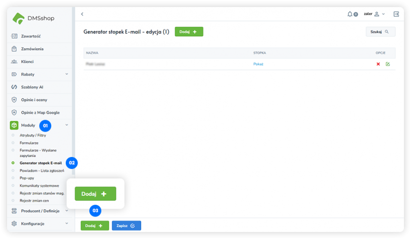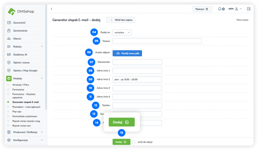 W systemie DMSshop moduł Generator stopek E-mail umożliwia tworzenie i zarządzanie stopkami wykorzystywanymi w wiadomościach e-mail wysyłanych ze sklepu. Pozwala na ujednolicenie wyglądu oraz treści korespondencji systemowej i marketingowej.