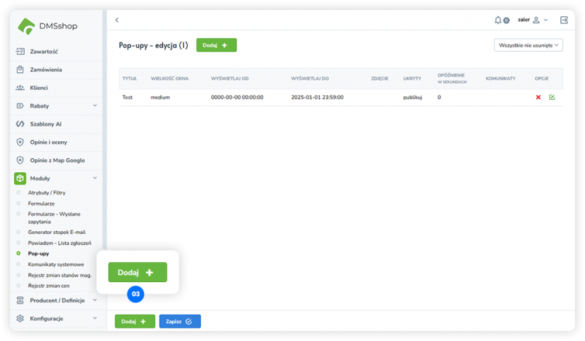 Dodaj – Zapisuje pop-up i aktywuje go zgodnie z ustawieniami.