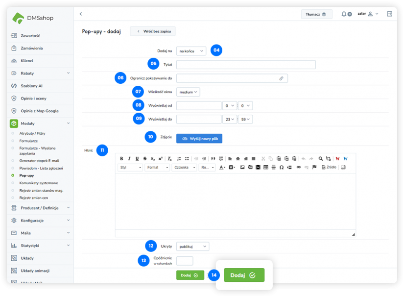 HTML – Edytor treści umożliwiający wprowadzenie zawartości pop-upu (tekst, grafiki, linki, formatowanie).