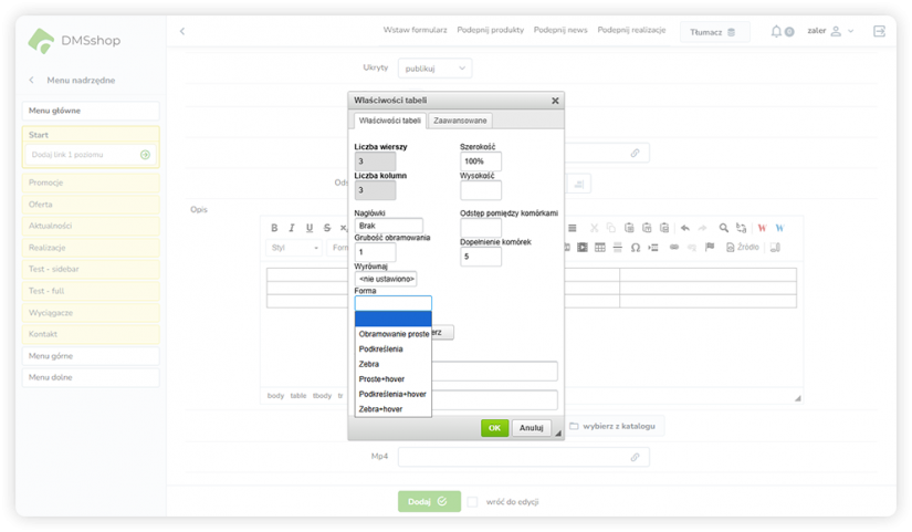 We właściwościach tabeli w DMSshop dostępna jest opcja wyboru stylu graficznego, który wpływa na sposób wyświetlania obramowań oraz wygląd poszczególnych wierszy. Dzięki temu tabela może zostać dopasowana do stylistyki strony, a prezentowane dane stają się bardziej czytelne i uporządkowane.