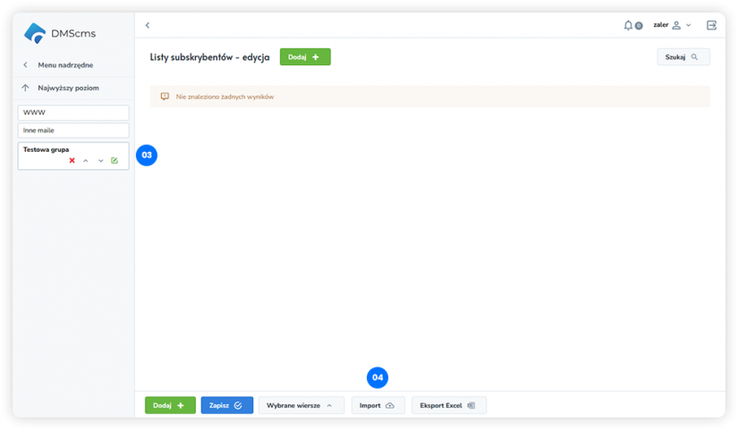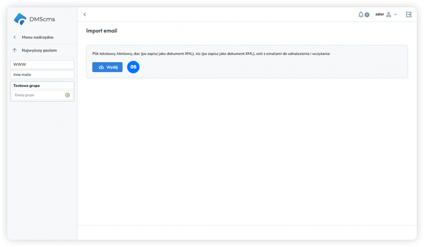 Aby zaimportować adresy e-mail do wybranej grupy w DMScms, wykonaj poniższe kroki: