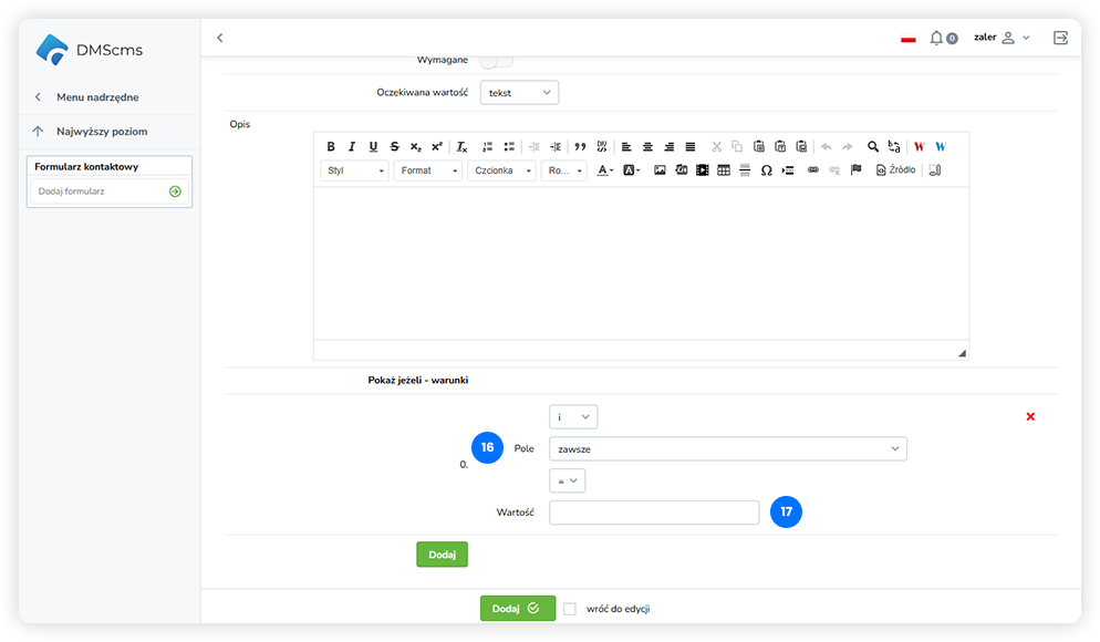 Wymagane – określa, czy pole jest obowiązkowe oraz czy podlega walidacji.