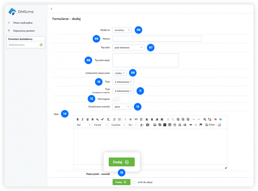 Formularze w DMScms umożliwiają tworzenie nieograniczonej liczby formularzy, które można wykorzystać na stronie internetowej w różnych celach — od prostych formularzy kontaktowych po rozbudowane formularze zapytań.