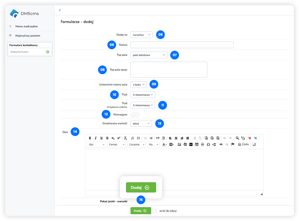 Dodaj – zapisuje pole i dodaje je do formularza.