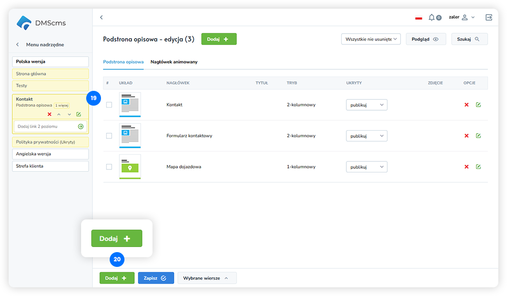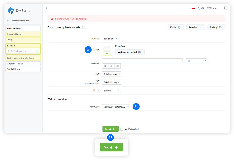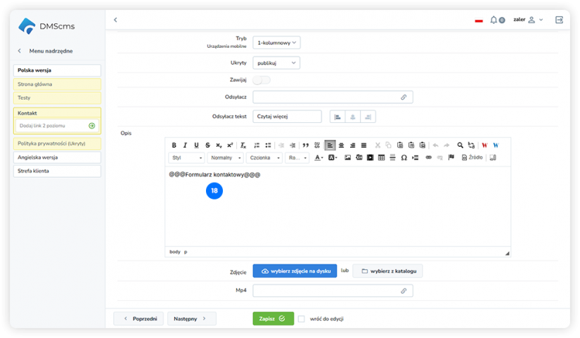 Po zapisaniu formularz zostanie dodany do podstrony jako osobny układ i będzie wyświetlany zgodnie z ustawieniami strony.