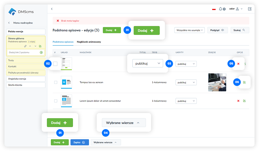 Zawartość każdej podstrony w systemie DMScms budowana jest w oparciu o akapity (wiersze). Każdy wiersz stanowi logiczny blok treści, składający się z tekstu oraz zdjęć rozmieszczonych według wybranego układu. Takie podejście zapewnia dużą elastyczność w prezentacji informacji oraz ułatwia dalszą rozbudowę strony.