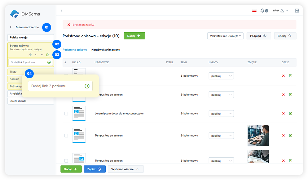 W wielu wdrożeniach DMScms pierwszy poziom menu, oznaczony kolorem szarym, jest nieedytowalny. Najczęściej odpowiada on za: