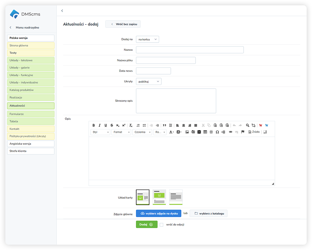 Moduł Aktualności w DMScms umożliwia publikowanie bieżących informacji, newsów oraz wpisów blogowych w uporządkowanej i spójnej formie. Formularz dodawania aktualności pozwala na precyzyjne określenie treści, daty publikacji oraz sposobu prezentacji wpisu.