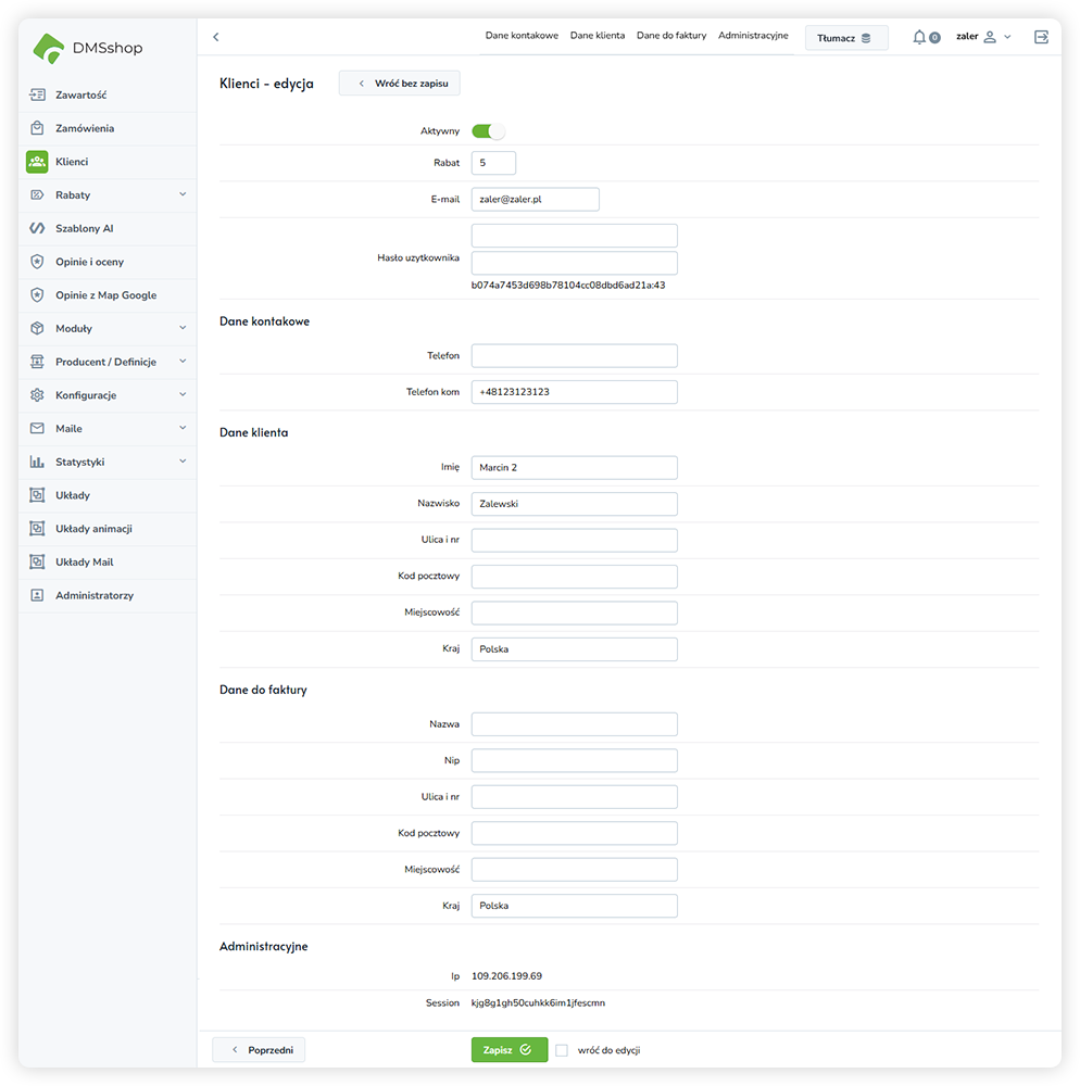 W systemie DMSshop widok edycji klienta umożliwia zarządzanie danymi konta klienta, jego informacjami kontaktowymi, danymi adresowymi oraz danymi do faktury. Widok ten pozwala również na kontrolę statusu konta oraz dostęp do podstawowych informacji administracyjnych.