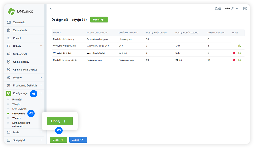 W systemie DMSshop sekcja Dostępność służy do zarządzania statusami dostępności produktów w sklepie internetowym. Moduł umożliwia definiowanie informacji wyświetlanych klientom na kartach produktów, takich jak dostępność od ręki, chwilowy brak towaru, produkt na zamówienie czy planowana dostępność w przyszłości.