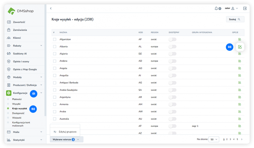 Dostępny – Włącza lub wyłącza możliwość wysyłki do danego kraju.