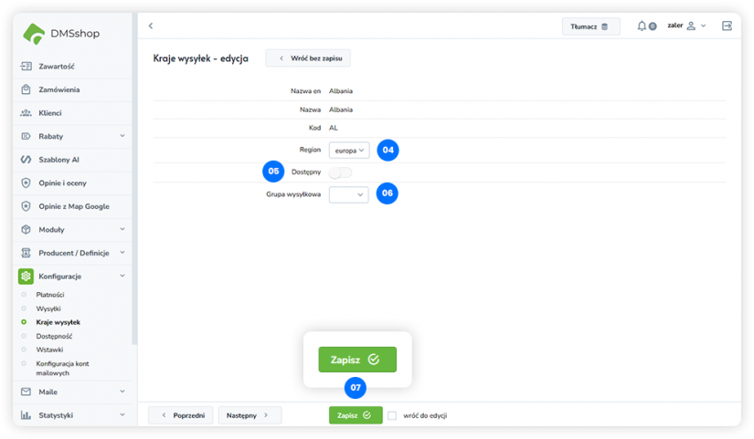Zapisz – Zapisuje zmiany i przypisuje kraj do wybranej grupy wysyłkowej.