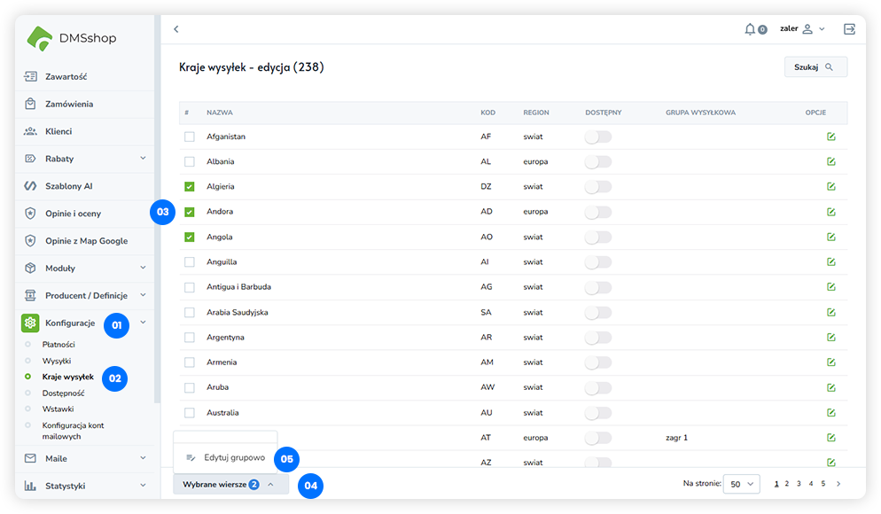W systemie DMSshop sekcja Kraje wysyłek umożliwia zarządzanie krajami oraz tworzenie grup wysyłkowych, które następnie wykorzystywane są przy konfiguracji metod dostawy. Moduł pozwala na logiczne grupowanie krajów, co ułatwia zarządzanie kosztami i dostępnością wysyłek.