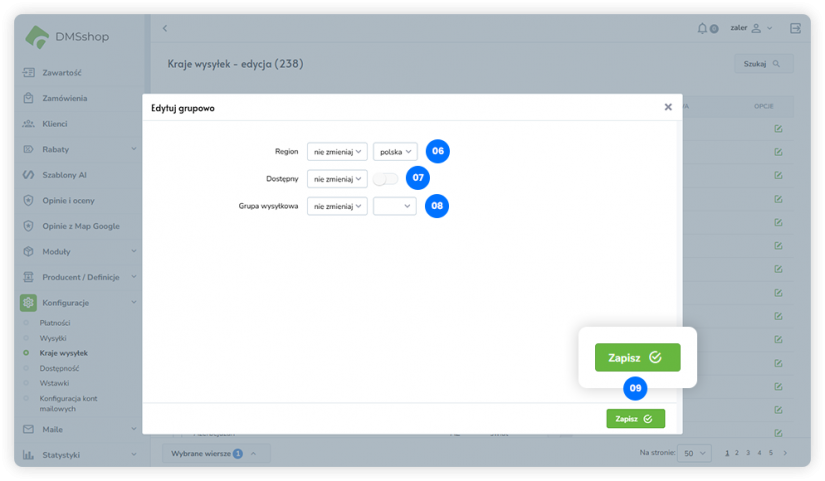 Utworzone grupy krajów mogą być przypisywane do konkretnych metod wysyłki w zakładce Konfiguracje → Wysyłki, gdzie określane są odpowiednie koszty dostawy oraz warunki realizacji zamówień dla wybranych obszarów. Dzięki temu możliwe jest elastyczne i przejrzyste zarządzanie wysyłkami krajowymi oraz zagranicznymi.