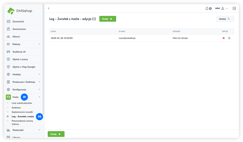 Sekcja Log – Zwrotek z maila w systemie DMSshop umożliwia podgląd wiadomości e-mail, które nie zostały poprawnie dostarczone do odbiorców (tzw. zwrotki). Dzięki temu administrator ma wgląd w informacje o błędnych adresach e-mail, przepełnionych skrzynkach lub problemach technicznych po stronie serwera odbiorcy, co pozwala na szybką reakcję i utrzymanie wysokiej jakości komunikacji mailingowej.
