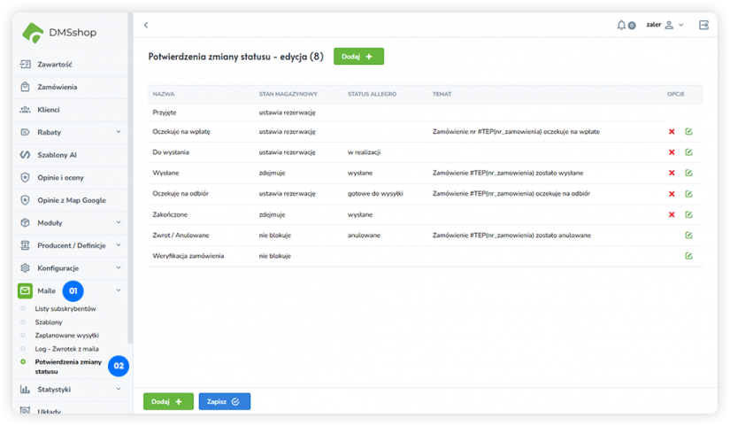 Wyświetli nam się lista gotowych wiadomościami e-mail wysyłanych do klientów po zmianie statusu zamówienia.