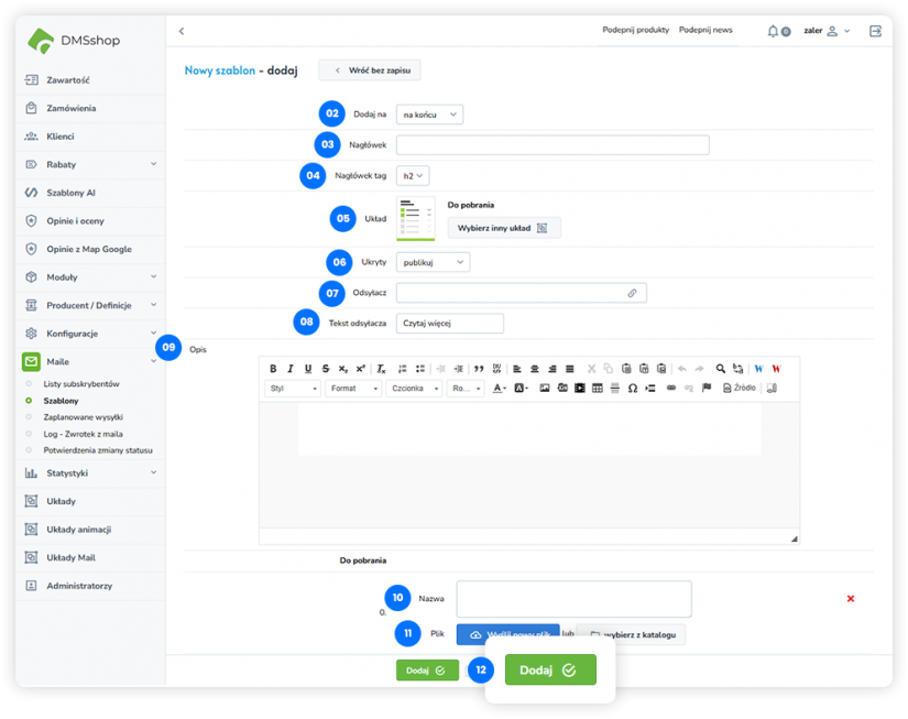 Dodaj – Zapisuje dodany plik i umieszcza sekcję „Do pobrania” w treści newslettera.