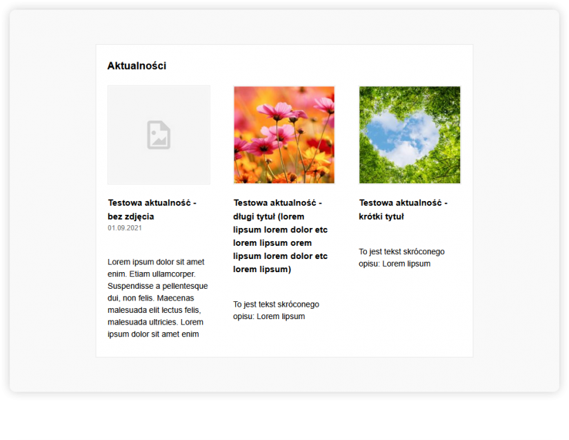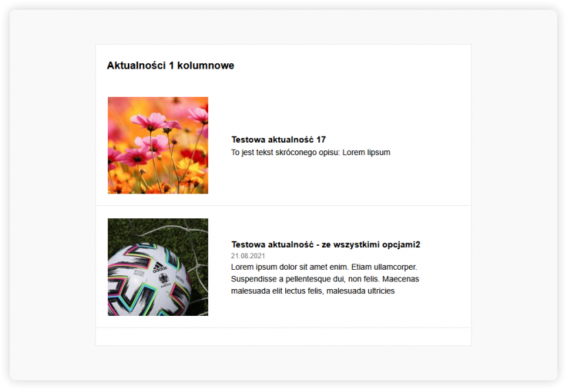 Układ służy do prezentowania wpisów z sekcji aktualności lub newsów. Pozwala informować klientów o nowościach, wydarzeniach, zmianach w ofercie czy komunikatach firmowych. Treści są pobierane bezpośrednio z systemu, co zapewnia ich spójność z zawartością sklepu oraz aktualność informacji.
