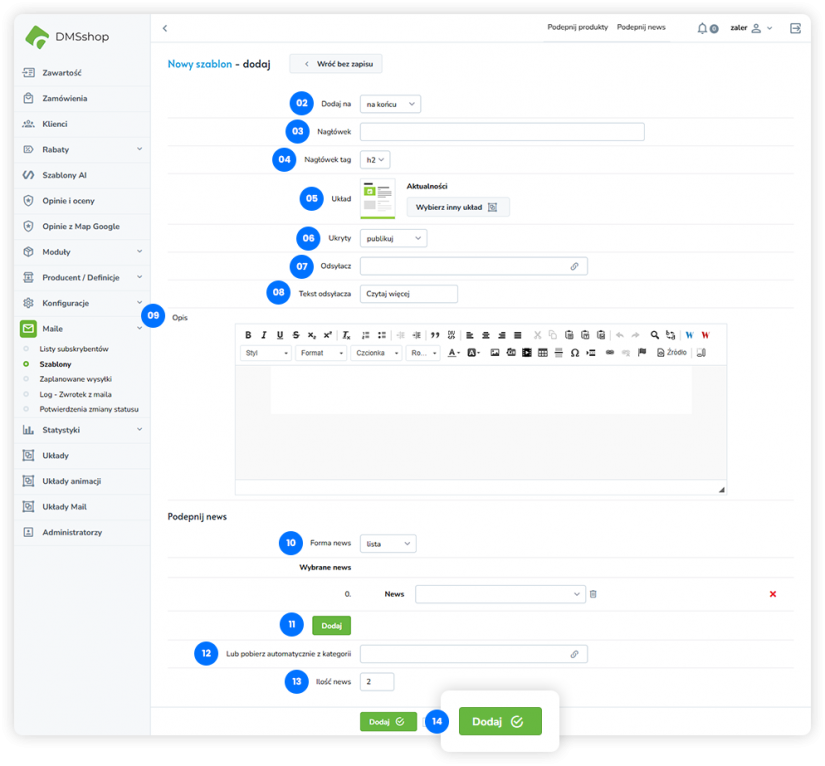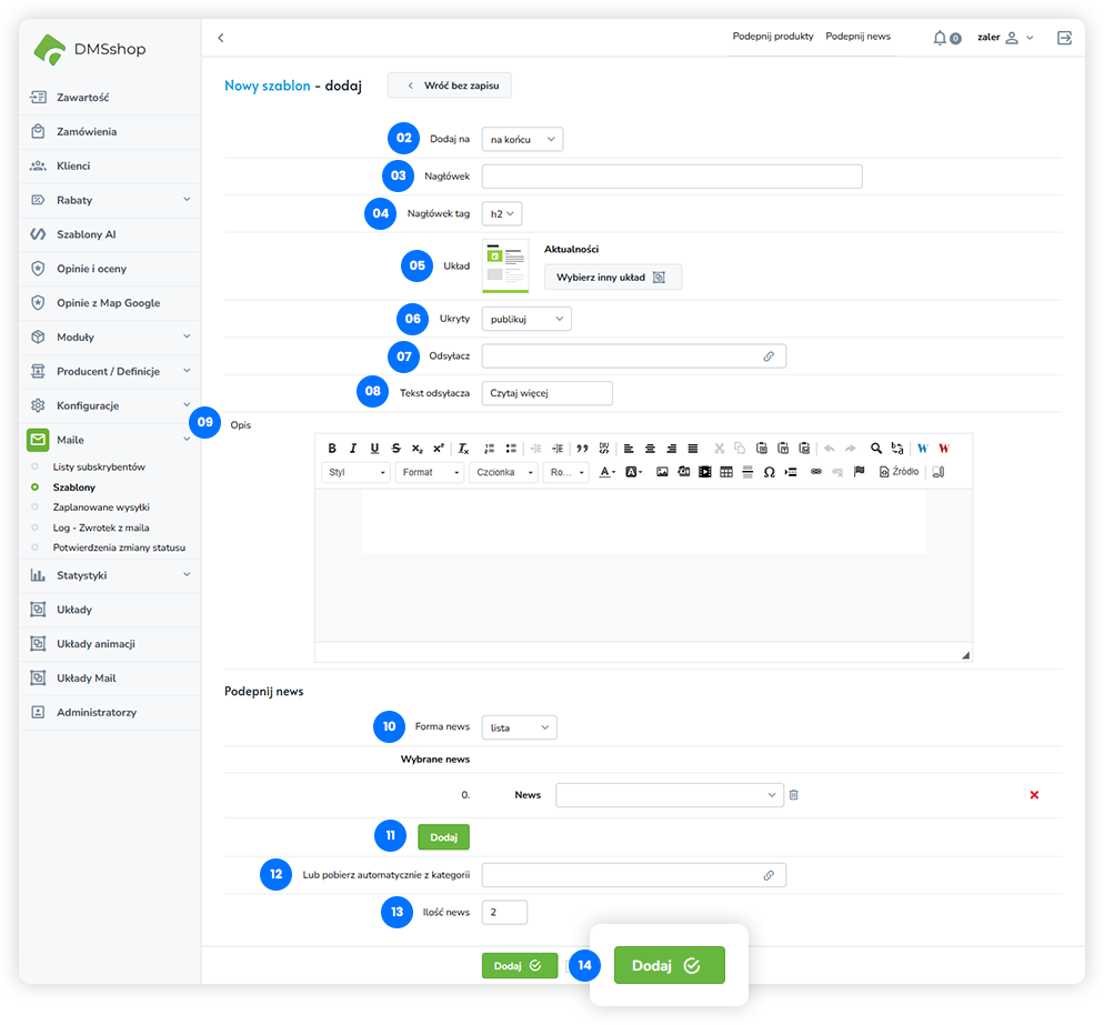 Dodaj – Zapisuje ustawienia i dodaje sekcję aktualności do treści newslettera