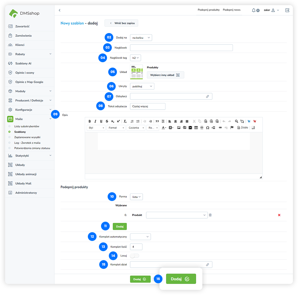 Dodaj – Zapisuje ustawienia i dodaje układ produktowy do treści newslettera.