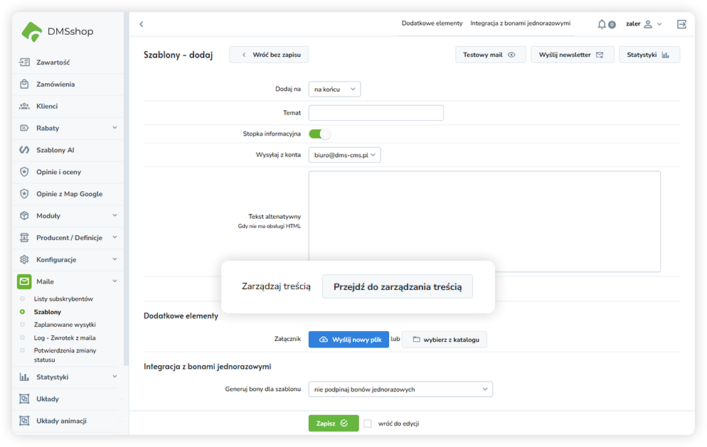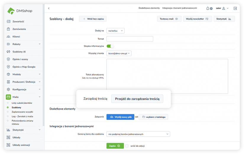 Układy funkcyjne newslettera w systemie DMSshop umożliwiają dynamiczne powiązanie treści wiadomości e-mail z danymi zgromadzonymi w sklepie. Dzięki nim newsletter przestaje być wyłącznie statyczną wiadomością, a staje się narzędziem sprzedażowym i informacyjnym, automatycznie prezentującym aktualne produkty, newsy oraz materiały do pobrania.