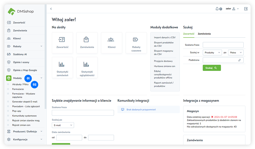 Zarządzanie atrybutami i filtrami dostępne jest po rozwinięciu ścieżki Moduły → Atrybuty / Filtry w panelu administracyjnym.