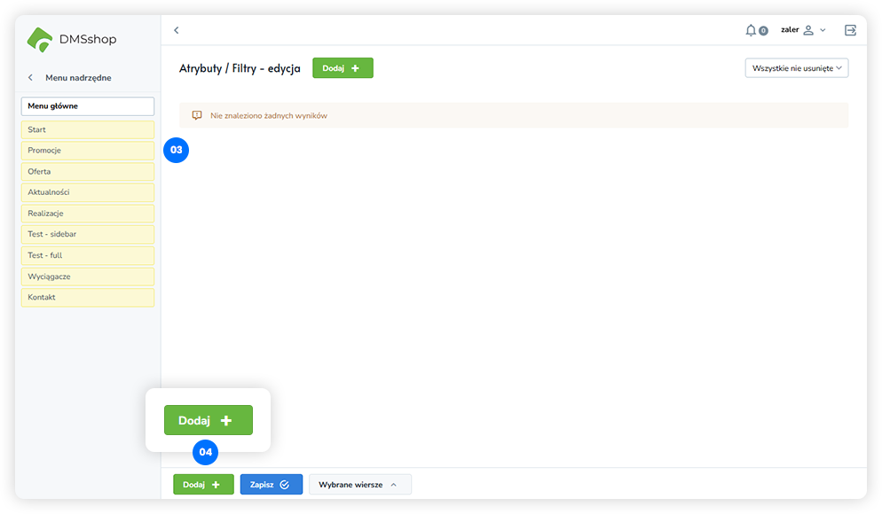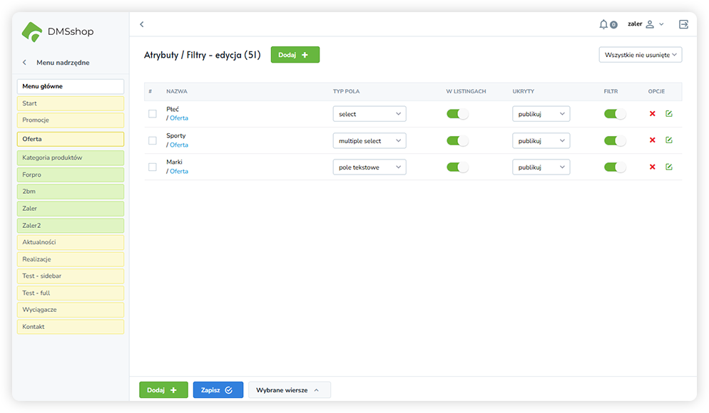 W systemie DMSshop moduł Atrybuty / Filtry umożliwia zarządzanie specyfikacją atrybutów opisujących właściwości produktów. Pozwala na dodawanie oraz usuwanie pól wykorzystywanych do prezentacji parametrów produktów w sklepie. Do dyspozycji dostępne są m.in. pola typu: pole opisowe, checkbox, lista wyboru (select) oraz nagłówek.