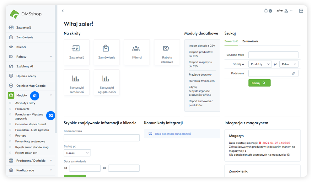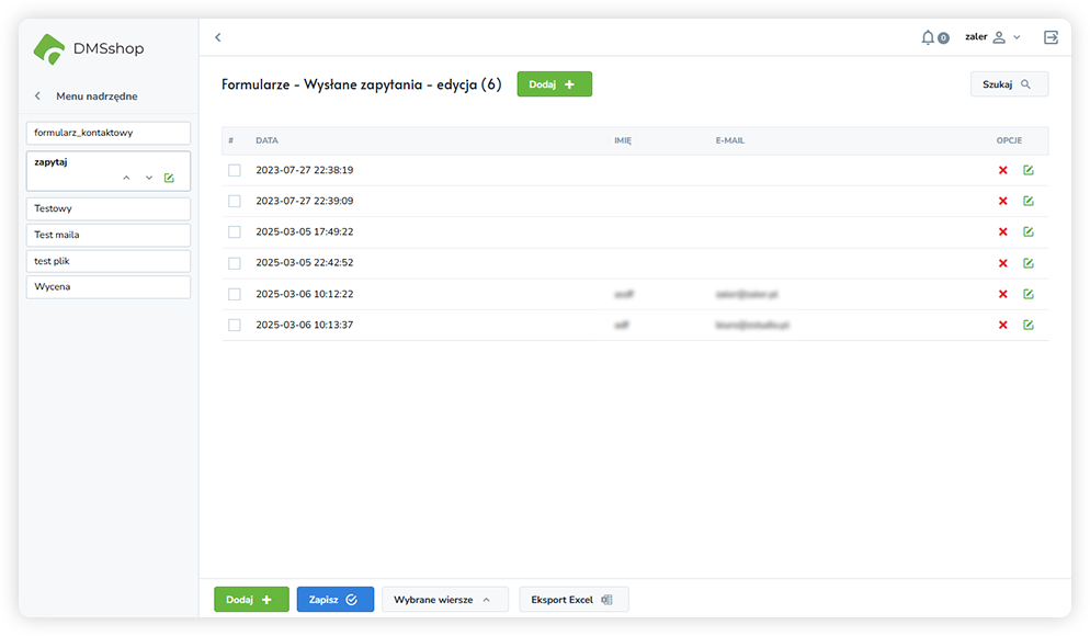 W systemie DMSshop sekcja Formularze – Wysłane zapytania umożliwia podgląd wszystkich zapytań przesłanych przez klientów za pośrednictwem formularzy dostępnych w sklepie. Niezależnie od tego, że wiadomość zostaje wysłana na główny adres e-mail sklepu, każda wysłana treść jest również zapisywana i prezentowana w panelu administracyjnym.
