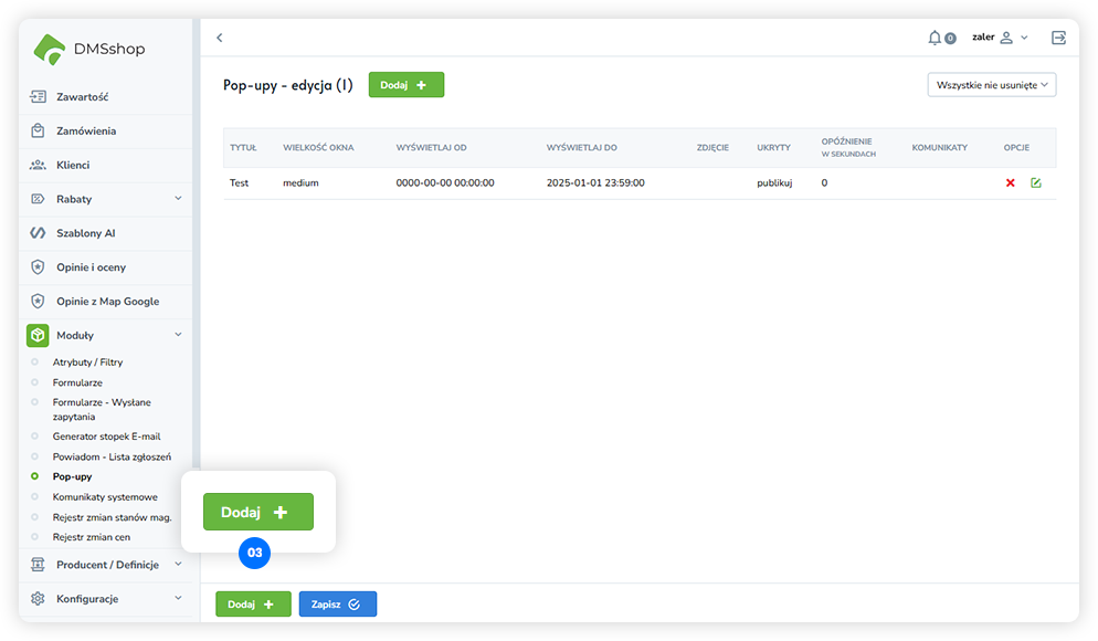 W systemie DMSshop moduł Pop-upy umożliwia tworzenie i zarządzanie oknami pop-up wyświetlanymi w sklepie internetowym. Pop-upy mogą być wykorzystywane do prezentowania komunikatów informacyjnych, promocji, zapisów do newslettera lub innych ważnych treści marketingowych.