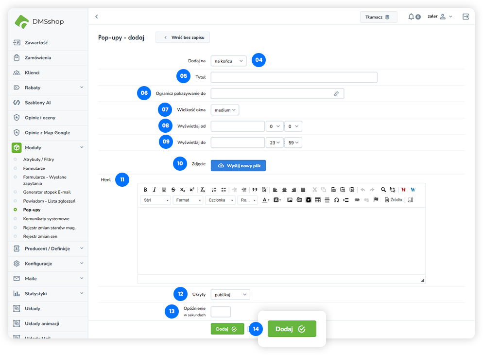 HTML – Edytor treści umożliwiający wprowadzenie zawartości pop-upu (tekst, grafiki, linki, formatowanie).