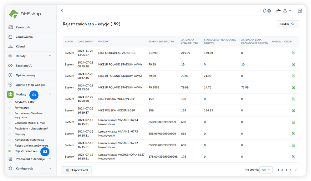W systemie DMSshop moduł Rejestr zmian cen umożliwia podgląd historii zmian cen produktów w sklepie. Rejestr zapisuje informacje o każdej modyfikacji ceny, co pozwala na pełną kontrolę nad polityką cenową.
