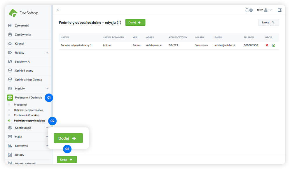 Dodaj – Zapisuje dane podmiotu odpowiedzialnego i udostępnia je do wykorzystania w systemie.