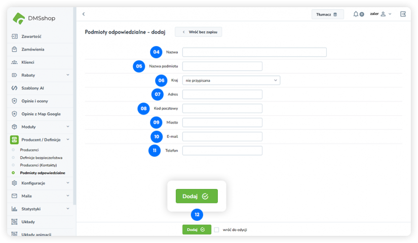 Podmioty odpowiedzialne mogą być wykorzystywane w definicjach bezpieczeństwa, przypisywane do producentów oraz prezentowane w dokumentach i informacjach udostępnianych klientom. Dzięki temu system zapewnia spójność danych, łatwe zarządzanie informacjami oraz spełnienie obowiązków prawnych w sklepie internetowym.