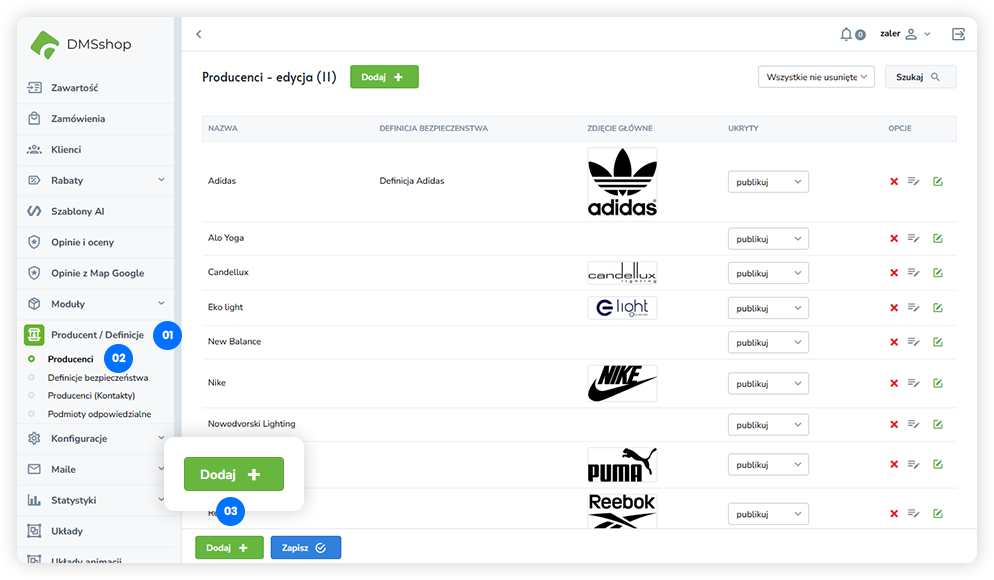 Ukryty / publikuj – Status widoczności producenta w sklepie.