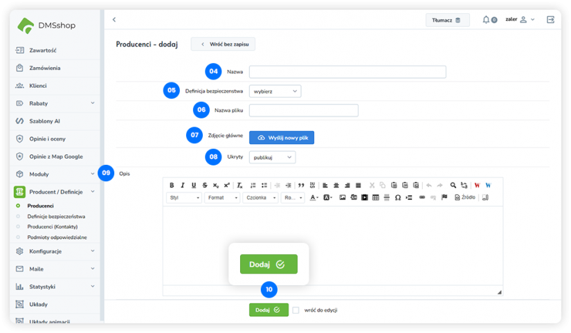 Opis – Edytor treści umożliwiający wprowadzenie opisu producenta, prezentowanego w sklepie lub wykorzystywanego informacyjnie.