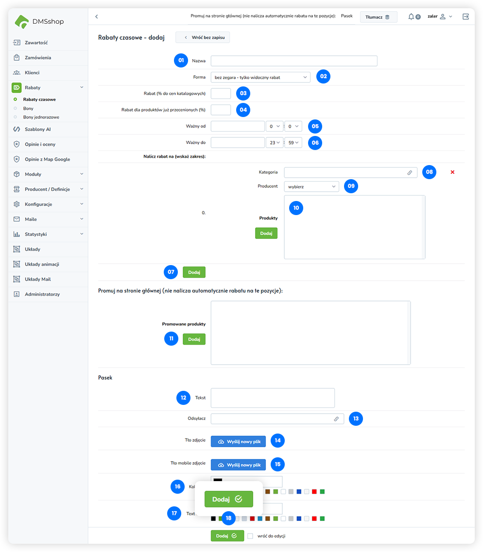 W systemie DMSshop rabaty czasowe stanowią podstawowy i najczęściej wykorzystywany mechanizm promocyjny. Pozwalają na precyzyjne określenie okresu aktywności rabatu oraz wartości obniżki ceny, wyrażonej procentowo względem ceny bazowej lub promocyjnej.