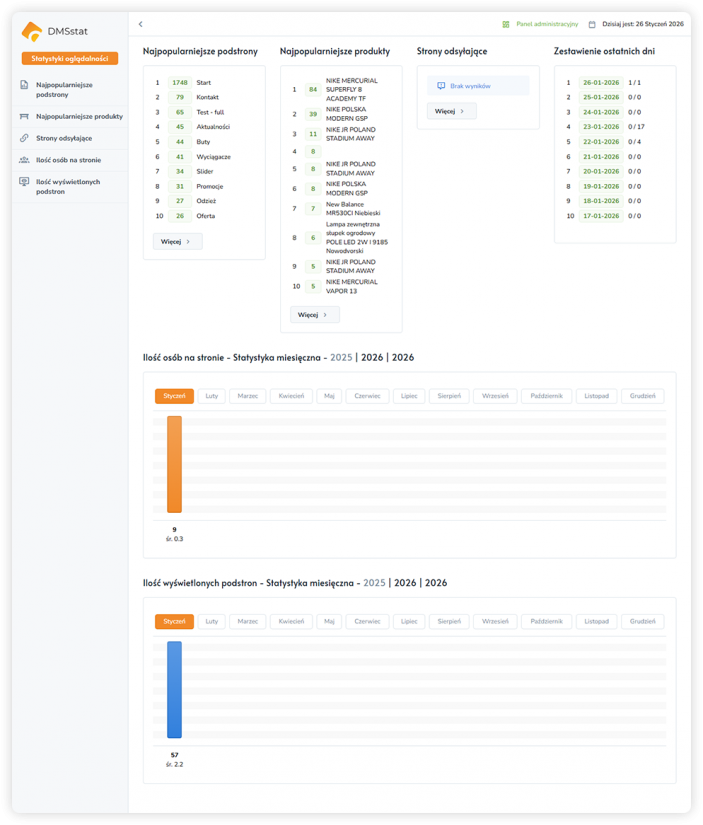 Widok Statystyki oglądalności w systemie DMSshop prezentuje szczegółowe dane dotyczące ruchu użytkowników w sklepie internetowym. Sekcja ta pozwala zrozumieć, jak klienci poruszają się po stronie, które treści przyciągają największą uwagę oraz jakie produkty i podstrony generują największe zainteresowanie.