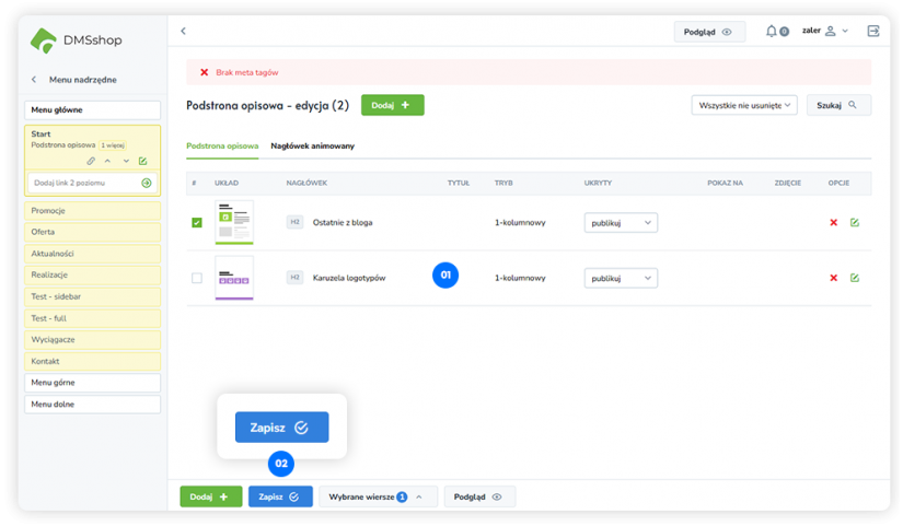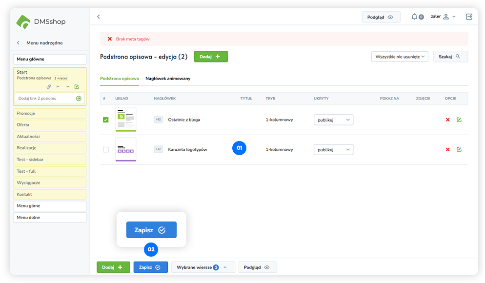 Przejdź do listy wierszy danej strony, kategorii lub karty produktu w panelu administracyjnym DMSshop.