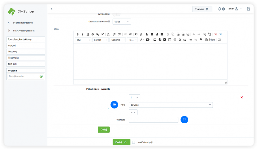 Opcja „Pokaż jeżeli” w DMSshop umożliwia warunkowe wyświetlanie pól formularza w zależności od wyborów dokonanych przez użytkownika. Dzięki temu możliwe jest tworzenie dynamicznych formularzy, które prezentują wyłącznie te pola, które są aktualnie potrzebne.