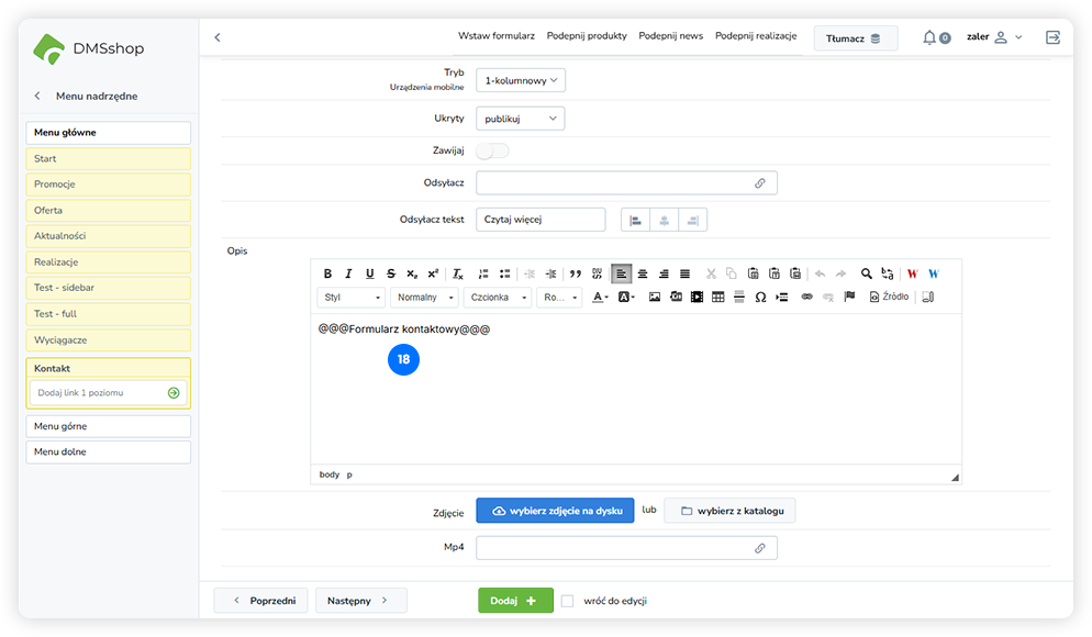 Aby dodać formularz do treści strony, należy wcześniej go utworzyć i w treści