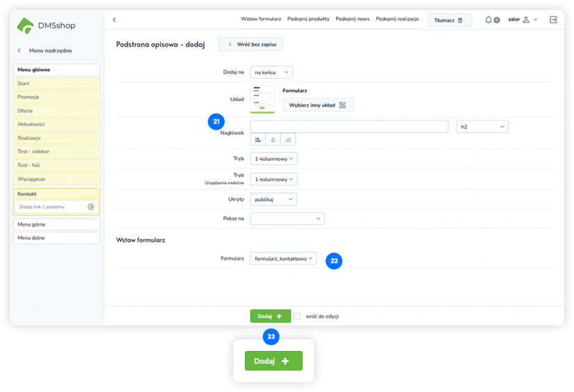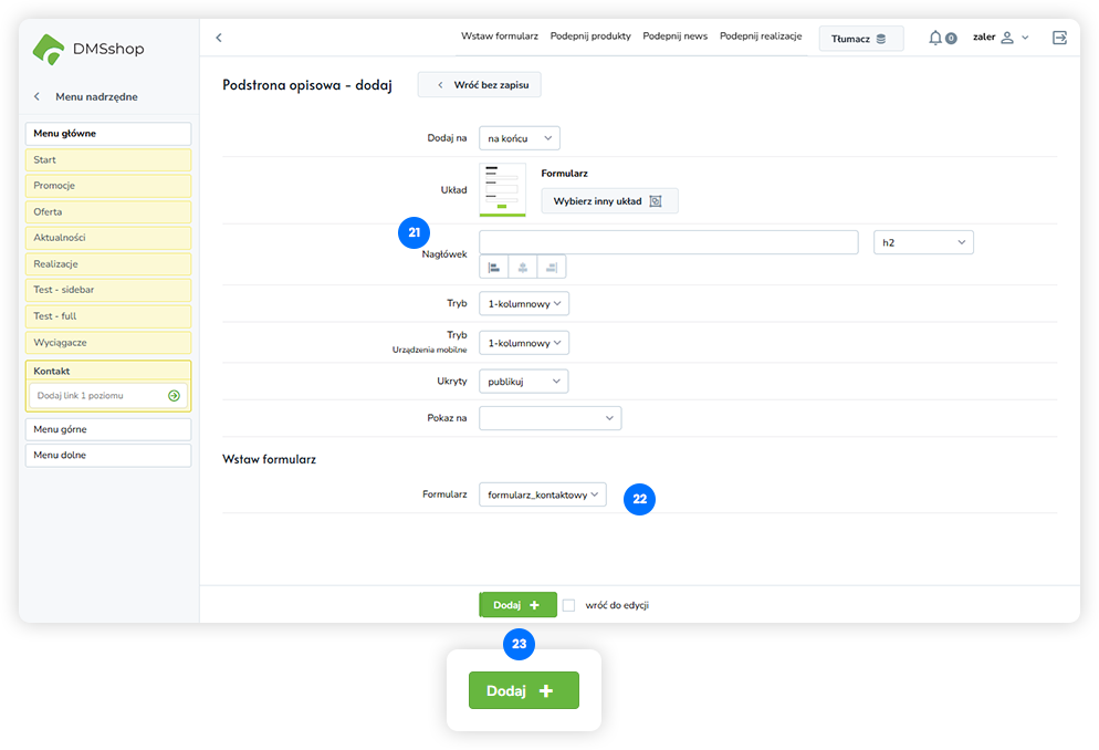 Po zapisaniu formularz zostanie dodany do podstrony jako osobny układ i będzie wyświetlany zgodnie z ustawieniami strony.