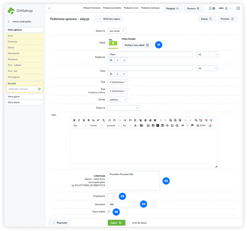 Układ „Mapa dojazdowa” w DMSshop pozwala na szybkie osadzenie interaktywnej mapy Google na wybranej podstronie. Dzięki temu użytkownicy mogą w prosty i intuicyjny sposób sprawdzić lokalizację firmy, punktu usługowego lub dowolnego wskazanego adresu.