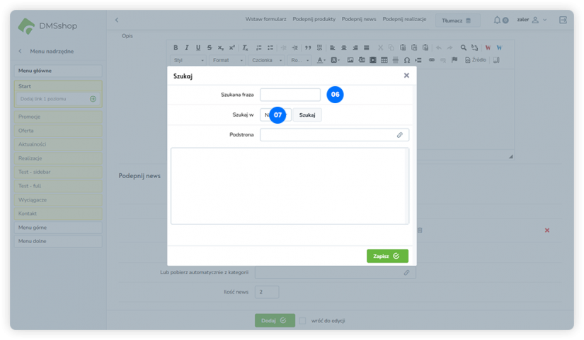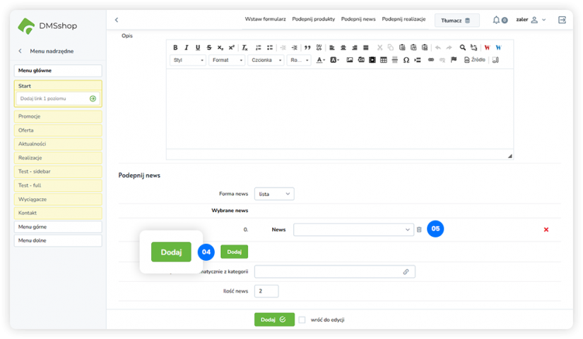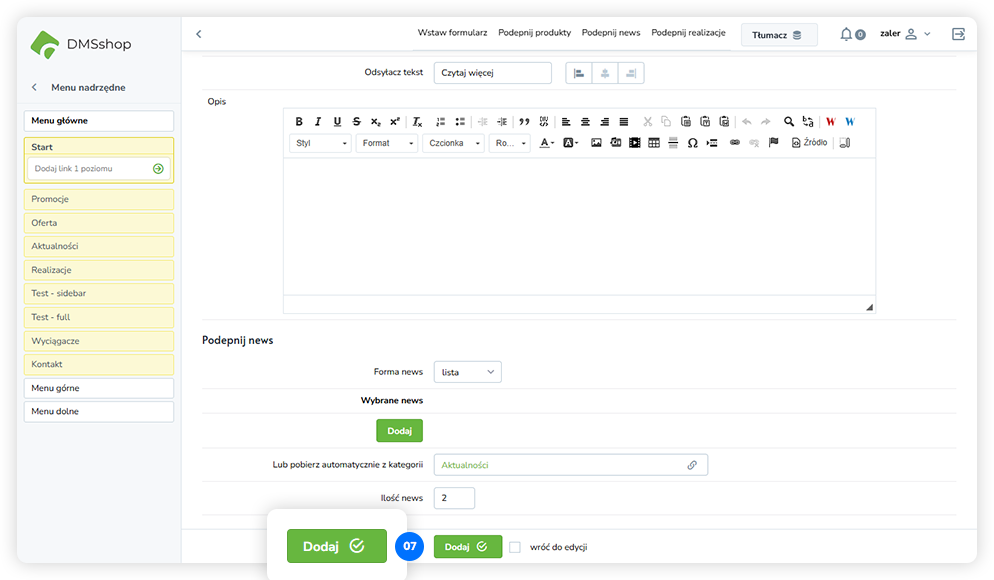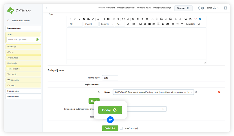 Zapisz całość, klikając przycisk „Dodaj” – newsy zostaną przypisane do wiersza i wyświetlane na stronie.