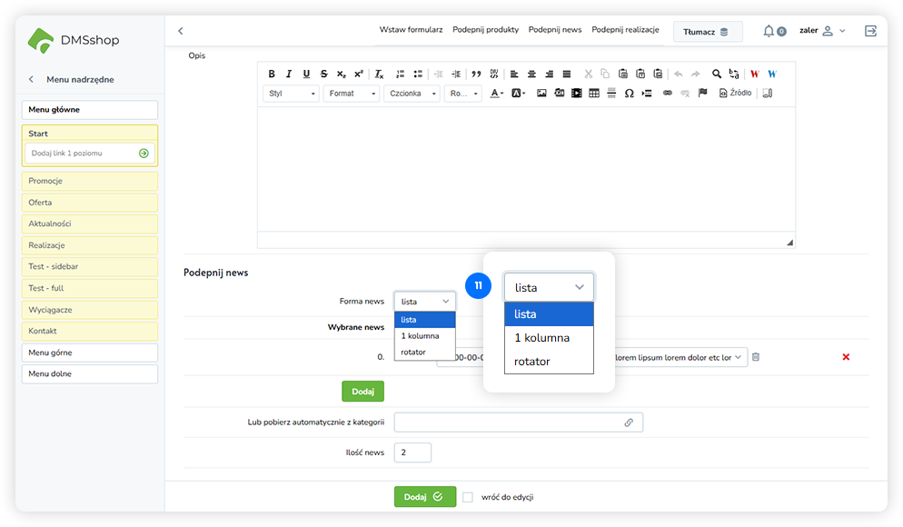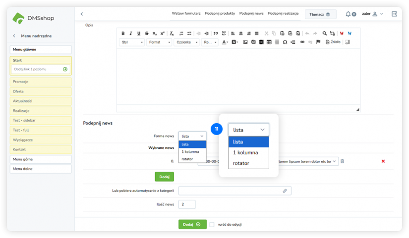 Układ „Podepnij news” w DMSshop umożliwia automatyczne lub ręczne podłączanie aktualności zapisanych w systemie oraz ich prezentację w formie listy lub slidera na wybranej podstronie.