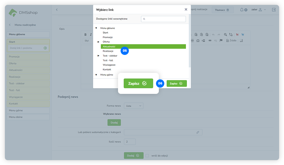 Kliknij „Zapisz”, aby dodać wybrany news do układu.