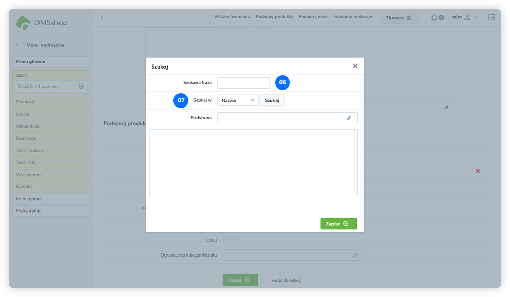 W polu „Szukana fraza” wpisz nazwę produktu, który chcesz dołączyć.